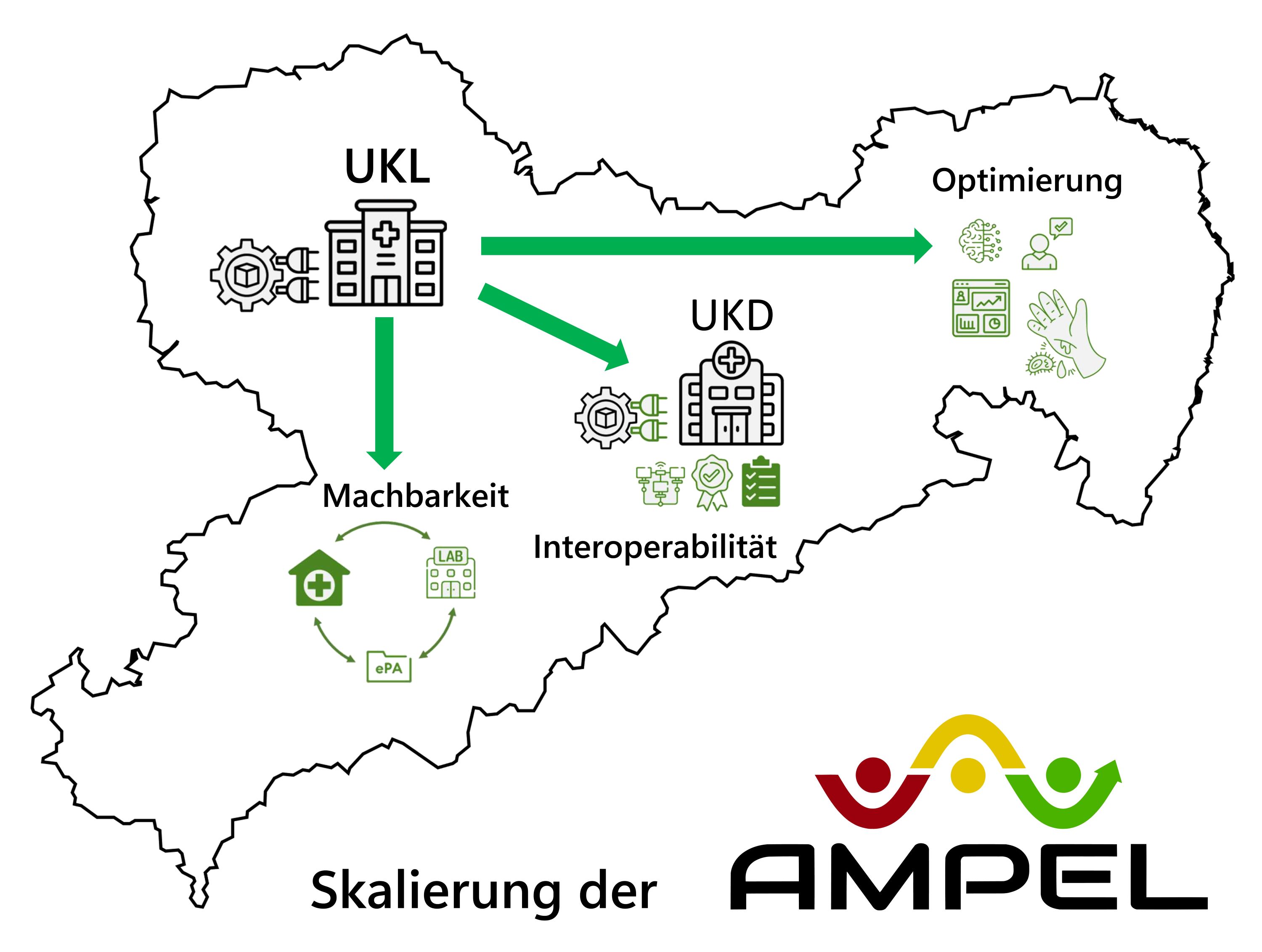 Das Projekt „Made in Saxony: Skalierung der klinischen KI-Unterstützung durch AMPEL" untersucht, wie die AMPEL-Plattform in die Breite skaliert werden kann. In enger Kooperation zwischen dem UKL, dem Universitätsklinikum Carl Gustav Carus sowie der Technischen Universität Dresden wird die prototypische Übertragung der AMPEL-Plattform auf einen externen Standort erprobt, eine nutzerzentriert optimierte Benutzeroberfläche sowie ein Machine-Learning-Modell zur Sepsis-Früherkennung entwickelt und validiert und die Übertragbarkeit auf den ländlichen und ambulanten Raum bei unterschiedlichster IT-Infrastruktur konzeptionell untersucht. Die Ergebnisse sollen eine evidenzbasierte Grundlage für eine mögliche sachsenweite Skalierung der AMPEL-Plattform schaffen.