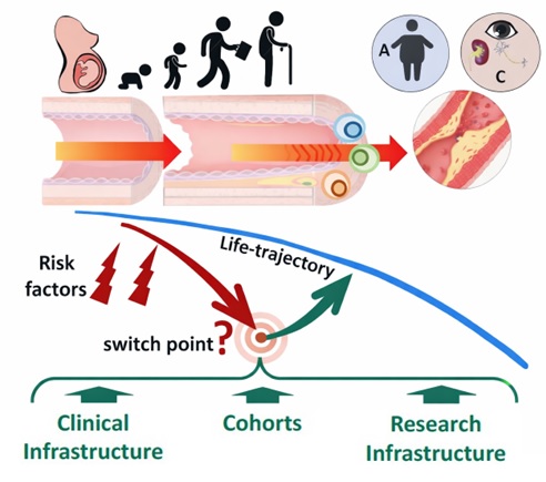 Risikofaktoren des modernen Lebensstils begünstigten eine Beschleunigung von Krankheitsverläufen – wobei jeder Krankheitsverlauf individuell ist. „switch points“, kritische mechanistische Ereignisse im Krankheitsverlauf, führen zu einer Chronifizierung vaskulo-metabolischer Erkrankungen. Die Untersuchung dieser „switch points“ und der damit verbundenen Krankheitsverläufe ermöglicht die Identifikation der zugrunde liegenden Mechanismen dieser „switch points“ sowie neuer pharmakologischer Zielstrukturen für chronische vaskulo-metabolische Erkrankungen (Adipositas, A; makrovaskuläre, B; und mikrovaskuläre, C, Erkrankungen).