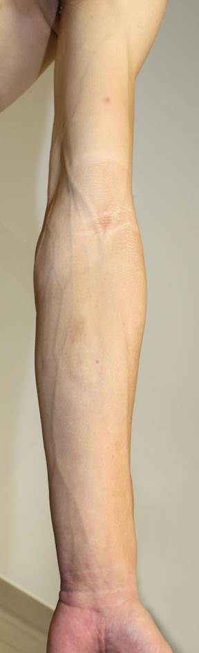 Muskulöses Aussehen und Hervortreten der Venenzeichnung durch fehlendes subkutanes Fettgewebe an Armen und Beinen bei Familiärer partieller Lipodystrophie Typ 2 |