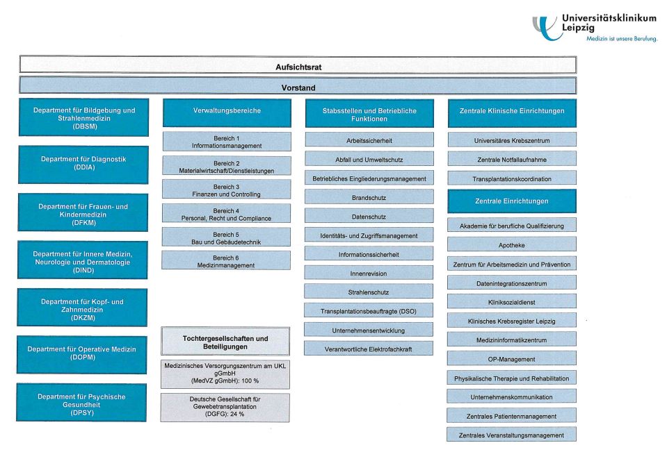 StartZurzeit ausgewähltNotizbuchZuletzt verwendetWebsiteinhalteSuchergebnisseSuchergebnisse Alle SeitenVorstand / Leitung des KlinikumsAufsichtsratDepartmentsBereicheStabsstellen und Betriebliche FunktionenZentrale Klinische EinrichtungenZentrale EinrichtungenMitarbeitervertreterDas Universitätsklinikum LeipzigUnsere gesellschaftliche Verantwortung Gemeinsame Führungsgrundsätze der Universitätsmedizin LeipzigLeitbild der Universitätsmedizin LeipzigJahres- und QualitätsberichteMit einer Spende helfenUniversitätsmedizin Leipzig in ZahlenPresse- und ÖffentlichkeitsarbeitProf. Dr. med. habil. Christoph Josten Der Vorstand Organisationsstruktur Aufsichtsrat Departments Bereiche Stabsstellen und Betriebliche Funktionen Zentrale Klinische Einrichtungen Zentrale Einrichtungen Mitarbeitervertreter Beauftragte Organigramm Zahlen & Fakten Vision - Strategie - Ziele Unsere Top-Rankings UKL-Einblicke - Unsere Medienwelt Mit einer Spende helfen Startseite Einrichtungen & Kliniken Kontakt Anscheinend ist in Ihrem Browser JavaScript nicht aktiviert. Aktivieren Sie bitte JavaScript, und versuchen Sie es erneut. English Wir über uns - Universitätsklinikum Leipzig Sie sind hier: Skip Navigation LinksWir über uns - Universitätsklinikum Leipzig Organisationsstruktur Organigramm Organigramm des Universitätsklinikums Leipzig Seiteninhalt ObenDie Organisationsstruktur des Uniklinikums Leipzig und die Zuordnung der einzelnen Kliniken, Abteilungen, Sektionen, Bereiche und Institute finden Sie im Organigramm (PDF). Auch durch klicken auf das Bild öffnet sich das PDF-Dokument. Liebigstraße 20, Haus 4 04103 Leipzig Telefon: 0341 - 97 109 7nach oben